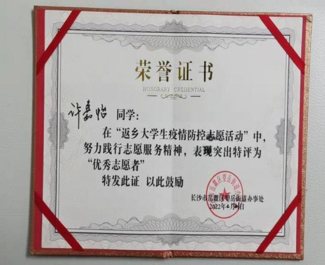 2022年,许嘉怡在长沙市岳麓区望岳街道办事处“返乡老员工疫情防控志愿活动”中,努力践行志愿服务精神,表现突出特评为“优秀志愿者”。