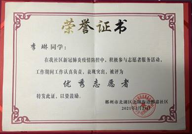 2021年寒假刚放假时,李琳就有回家做志愿者的打算,在看到郴州市北湖区北湖街道郴嘉社区社区门口的志愿者招募公告后就立马报名参加。当上志愿者后,他主要进行测量进出社区居民体温、登记出入车辆以及调查外地返郴人员的行程等工作。他细致认真对待每一次工作,顺利通过了志愿服务工作的考验。社区为鼓励他的优异表现,为他颁发了“优秀志愿者”荣誉证书。