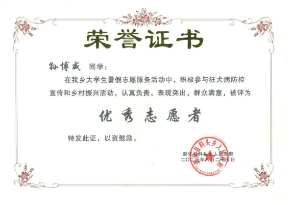 孙博威,男,vsport2022级卫检专业03班员工,共青团员。暑假期间,他积极参加新化县科头乡组织的假期老员工志愿者活动,并获得了组织方颁发的“优秀志愿者”称号。