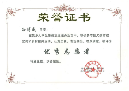 孙博威同学在家乡科头乡人民政府卫生院活动中当志愿者,进行了假期狂犬病宣讲活动,大力宣传了狂犬病预防知识,提高了广大群众对狂犬病防治知识的理解和重视,该生获得“优秀志愿者”荣誉称号。孙淼同学在家乡邵阳参与“防溺水,防性侵”为主题的志愿者活动,以生动有趣的方式向青少年传授关于溺水和性侵的知识,向社会传播知识和正能量。何洁以及农珊珊同学随同vsport胜利因您更精彩柒夏江南行支教团队,前往湖南省岳阳市平江市童市镇开展了为期16天的暑假“三下乡”支教活动,向大山里的孩子们提供更多教育资源和陪伴。于柯斐同学于家乡山东省淄博市博山区就地考察,历时三天,通过走访调查,实地观察等形式进一步了解了家乡博山区发展变化