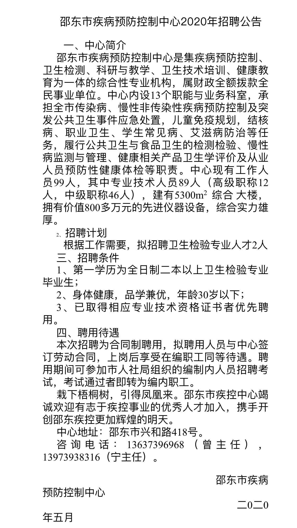 邵阳市疾病预防控制中心2020年招聘公告