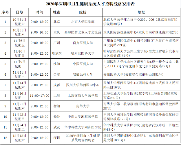 10月31日-12月12日,深圳市卫健委将组织全市医疗卫生机构在全国12个城市“巡回”招聘