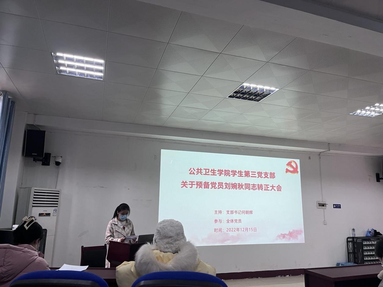 会议第二部分,进行预备党员转正会议。大会按照党员转正规程,先由转正对象刘婉秋同志向大家宣读了转正申请书,表明了自己的决心。随后,党小组成员介绍刘婉秋在预备期的考察情况,接着支部委员宣读刘婉秋在预备期的教育考察情况,各位党员也对刘婉秋同志入学以来的表现进行了评议,经过党员同志的无记名投票,党支部一致通过了刘婉秋同志的转正申请。