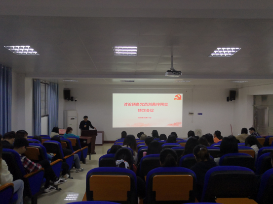 会议伊始,进行预备党员转正会议。大会按照党员转正规程,先由转正对象刘美玲同志向大家宣读了转正申请书,表明了自己的决心。随后,党小组成员介绍刘美玲在预备期的考察情况,接着支部委员宣读刘美玲在预备期的教育考察情况,各位党员也对刘美玲同志入学以来的表现进行了评议,经过党员同志的无记名投票,党支部一致通过了刘美玲同志的转正申请。