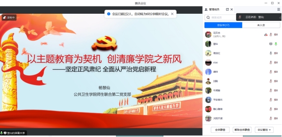 7月12日下午,公司副经理杨慧仙同志线上讲授了微党课。本次微党课的主题为“以主题教育为契机,创清廉公司之新风”。她结合“六尺巷”“杨震拒贿”“子罕一不贪为宝”等廉洁故事引导党员同志扬信念之帆;强调党员同志要存敬畏之念,敬畏权利、组织和党纪国法;号召党员同志要常怀感恩之心、享知足之乐。课后,她要求各位党员同志要增强廉洁自律意识,做到明纪在心、挺纪在前,要认真落实八项规定,廉洁规范组织好此次“卫检盛会”。