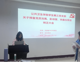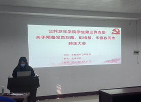 会议第一部分,进行刘禹、彭诗慧、宋嘉仪等三名同志预备党员转正会议。大会按照党员转正规程,按程序逐一讨论。先由转正对象向大家宣读了转正申请书,表明了自己的决心。随后,党小组成员介绍在预备期的考察情况,接着支部委员宣读在预备期的教育考察情况,各位党员也对三位同志入学以来的表现进行了评议,通过无记名投票表决,党支部一致通过了刘禹、彭诗慧、宋嘉仪三位同志的转正申请。