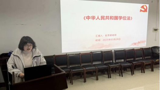 随后,彭芳君同志以“《中华人民共和国学位法》解读”为题,为全体党员讲授了一堂生动的党课。党课围绕学位法的立法背景、主要内容及其对学术规范的重要意义展开,帮助同学们深入理解学位法对学术诚信和教育公平的保障作用。彭芳君特别指出,学位法的出台不仅规范了学位授予程序,还对学术不端行为提出了明确的惩戒措施,并讲述了身边学术不端的案例。通过学习,同学们深刻认识到学术诚信的重要性,并表示将严格遵守学术规范,为营造风清气正的学术环境贡献力量。